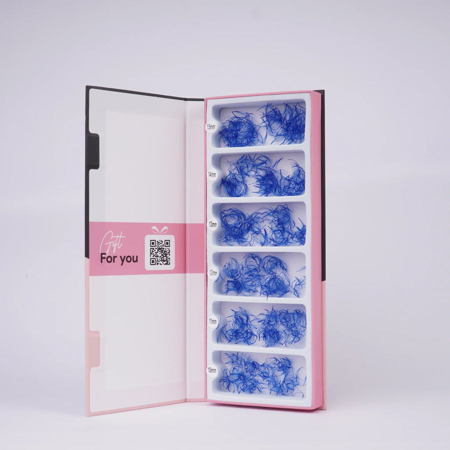 Our wispy promade fans, consisting of 7 lashes, effortlessly create the iconic Kim K wispy volume set with a unique combination of 6 x 0.07 lashes and in-built spikes. The spikes in the center, 2-3mm longer, add a textured, perfectly imperfect touch. Ideal for those desiring an artistic touch, these fans allow for varied lash lengths, creating highs and lows across the eyes, and crafting distinctive spikes with closed fans.